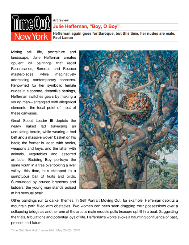 Akin to Magical Realism, Julie Heffernan's lush self-portraiture utilizes a myriad of art historical references to present a sensual interior narrative, a self-allegory whose half- hidden political agenda is the literal background of the paintings. The dark, Grimm fairy tale-like undercurrent transforms her aristocratic, operatic portraits into a contemporary vanitas or memento mori, acting as both a stylized fantasy and a Bosch-like warning.