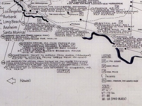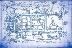 Mark Bennett's (b. 1956, Tennessee) whimsical works engage with pop culture and celebrity to an extreme degree. His blueprint lithographs of Baby Boom era sitcoms and popular television series depict the ultimate pairing of flight of fancy and stoical logic; the purely imaginary floor plans grounded by the dry format of an architect's design. His works are both pleasingly nostalgic and vaguely disconcerting in their premonition of a society obsessed by television and celebrity culture.