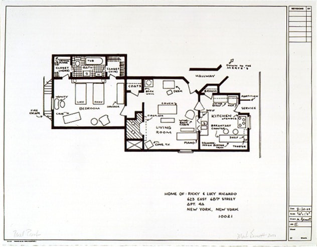 Mark Bennett's (b. 1956, Tennessee) whimsical works engage with pop culture and celebrity to an extreme degree. His blueprint lithographs of Baby Boom era sitcoms and popular television series depict the ultimate pairing of flight of fancy and stoical logic; the purely imaginary floor plans grounded by the dry format of an architect's design. His works are both pleasingly nostalgic and vaguely disconcerting in their premonition of a society obsessed by television and celebrity culture.