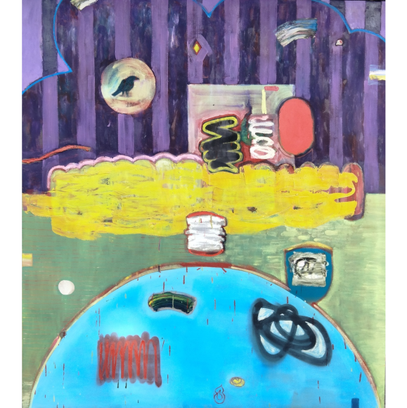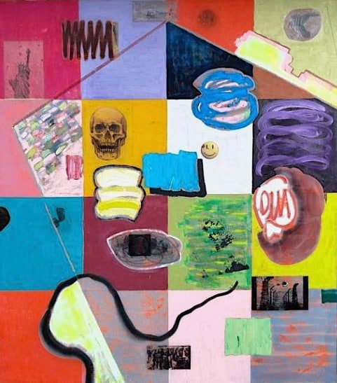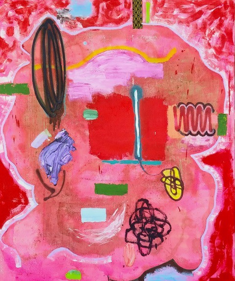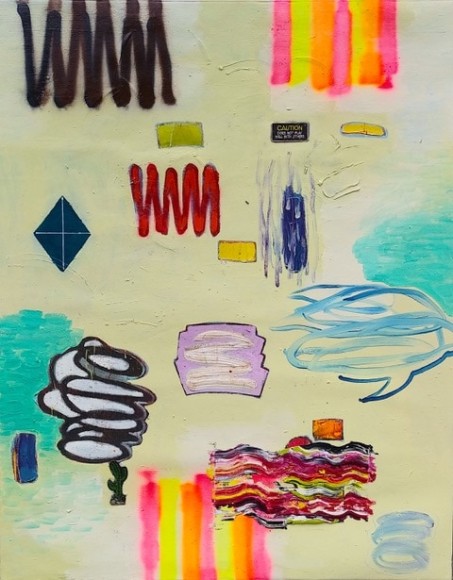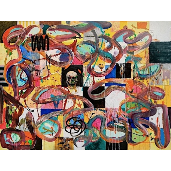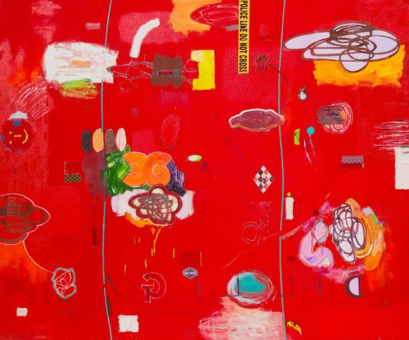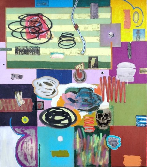They function as discursive formations between images, gestures, signs, symbols, in a fluid, contingent and multi-layered network of meanings and possible relationships. They incorporate, on the same picture plane, a mixture of historical reference, auto-biography and sub-cultural content in a shifting soup of knowledge, conjecture, opinion, guesswork, and the irrational. This interpenetration occurs when the histories of abstract mark making, an ongoing developing iconography and sub-cultural motifs are placed in relationships on the picture plane. The ‘arena’ of the picture plane (although implying one section of an infinite extension via hinted at grids), is a site of conflict for a merging of emotional states, conceptual ideas, memories and autobiography, where the notion of knowledge and understanding is contested. The connections between ‘events’ within that space create potential new relationships of meaning that accept uncertainty and the possibility of failure.