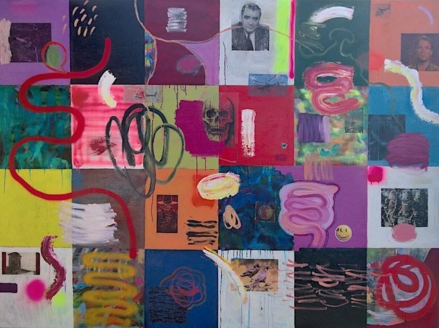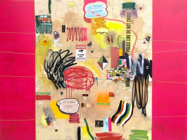 Disparate elements (of mark, motif, image and gesture) allow for a networking of possibilities, a web akin to the nature of the Mind, that reflect the problem-solving and pattern recognition search of our innate way of existing in the world. Any inherent cohesion is hermetic, oft times illogical, but is reformulated by the active participation of the mind viewing it. This is not an acceptance of the ’subjective’, as an all-is-acceptable interpretation, but rather a realism-based acknowledgment of the non-linear and cultural set of the brain’s ordering processes. They are built through an intuitive initial phase that is then 'modified' by formal concerns and the addition of these elements. My approach is somewhat akin to curating - selecting separate, disparate motifs and approaches and assembling on to the picture plane to form a new web of ideas. These aspects remain isolated and existential, although in a relationship with each other, expanding their potential and giving rise to complex structures of understanding, questioning and possibility . I incorporate elements from real life, in the form of badges, patches and photo transfer images onto the surface as a reference to existing sub-cultures and realities.