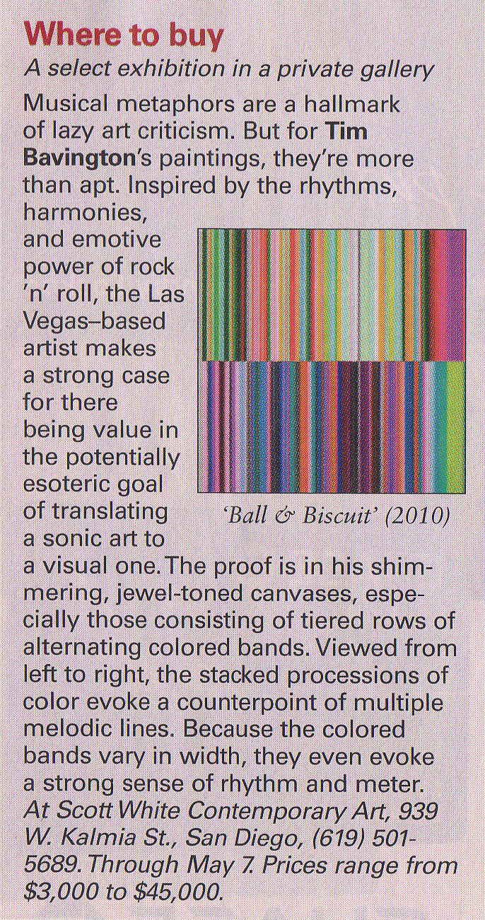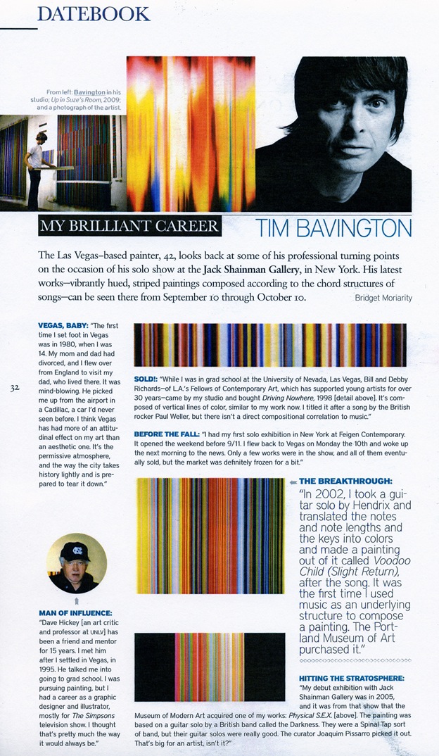 Tim Bavington (b. 1966, England) received his BFA from the Art Center (CA) before making the permanent move to Las Vegas, where he completed his MFA at the University of Nevada, Las Vegas (NV). His work is included in the public collections of Fredrick R. Weisman Collection (CA), Crocker Art Museum (CA), Honolulu Art Museum (HI), Albright-Knox Art Gallery (NY), Creative Artists Agency (CA), Joslyn Art Museum (NE), Museum of Contemporary Art, San Diego (CA), Portland Art Museum (OR), United Talent Agency (CA), Vivendi Universal (CA), Palm Springs Art Museum (CA), Denver Art Museum (CO), The Museum of Modern Art (NY), Nora Eccles Harrison Museum of Art, Utah State University (UT) and the McNay Art Museum (TX). He has exhibited at LeeAhn Gallery (Daegu), Jack Shainman Gallery (NY), Galerie Jean-Luc & Takako Richard (Paris), Space Gallery (London), Museum of Fine Arts (MA), Laguna Art Museum (CA), Museo de Arte Contemporaneo de Buenos Aires, and the Texas Fine Arts Center (TX) among others.