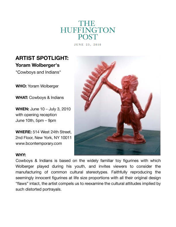 Yoram Wolberger uses childhood toys and everyday domestic items to create his large scale sculptures, foregrounding the latent symbolism and cultural paradigms of these objects that so subtly inform Western culture. By enlarging this ephemera to life size, Wolberger emphasizes the distortions of their original manufacture disallowing any real illusion and conceptually forcing the viewer to reconsider their meanings. When enlarged beyond any possibility of dismissal, we see that toy soldiers create lines between Us and Them, plastic cowboys and Indians marginalize and stereotype the Other, even wedding cake bride and groom figurines dictate our expected gender roles.