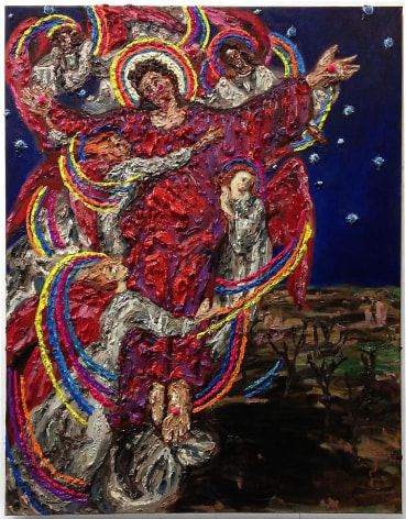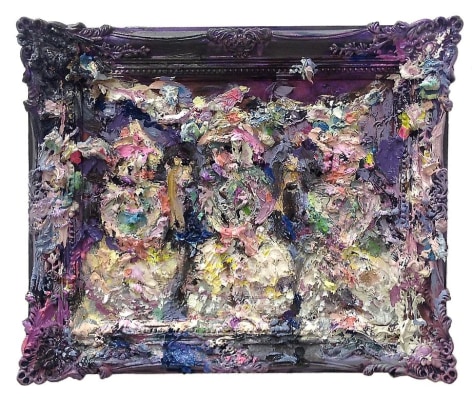 The fashioning of one's identity is a clumsy series of trial and error. Pushing through childhood, adolescence, token "awkward phase," and subsequent adulthood, we contextualize ourselves by referencing alternatives – engaging in a lifetime comparison between self and other. McKenzie's gloppy, candid, and purposefully unpolished assemblages and paintings typify the awkward plight of realized versus imagined personage. Haphazard rhinestones are embedded in stylized reproductions of Fragonard, Vermeer, and O'Keefe works, the details of which are obscured by McKenzie's abstract-impressionistic dabs, blobs, and smears. In another dialect of the same language, she explores the arbitrary emblems associated with gender constructs through diptych installations of original and simulacrum works. Rainbows, unicorns, bows, and clouds are assembled on the wall, then meticulously imitated in a sister painting – as if demonstrating the diligent mimicry exercised in creating the projected ego. While riddled with intentional imperfections and inelegance, McKenzie's paintings bespeak the innocence of a shared desire for acceptance or self-fulfillment, and the cultural motifs that shape its incarnations.