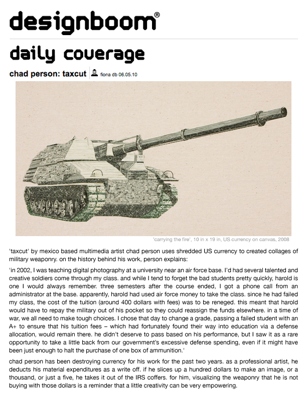 "New Mexico-based multimedia artist Chad Person creates beautifully crafted, ironic indictments on society's most dangerous flaws." – Shana Nys Dambrot, Flavorwire (2010)