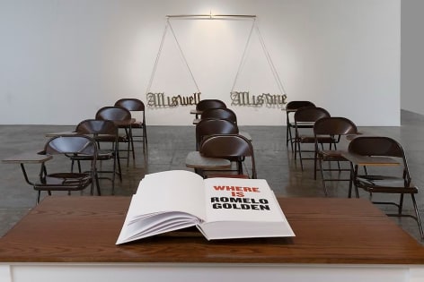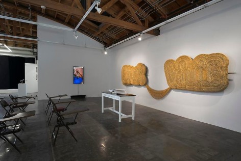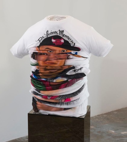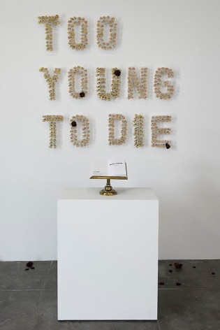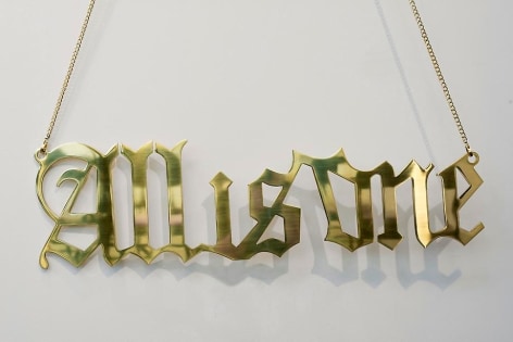Known for its alarming murder rate, the city of Chicago serves as Pope's primary motivation for examining how issues of connectivity and community affect its largely segregated neighborhoods. Works such as "Black_White (Broach)" (2014) visualize the racial tension of the city by literally linking the words "black" and "white" together with faux gold chains – thus creating two large broaches that, if worn, would adjoin two individuals. The interwoven broaches suggest the need for communal dialogue, and also illustrate how the effects of violence on one individual is intrinsically linked to that of another. Her video "One of Many, One" (2014) further delves into the seemingly inexhaustible chain reaction created by gun violence. The video portrays a series of Chicago youth dressing themselves in memorial "RIP" t-shirts. Beginning with an individual putting on one shirt, the video progresses in a similar fashion to a cumulative song – each subsequent youth wears one more shirt than the individual preceding him or her, and each new shirt bears their predecessor’s face. The accumulating loss grows increasingly personal as each successor is faced with the reality that they are next in line to be mourned. Other works such as "Too Young to Die" (2014) and "In Loving Memory (altar)" (2014) metaphorically symbolize the tragic loss of Chicago’s young populations. As an extension of her work, the artist has invited a guest to attend the opening: Britteney Black Rose Kapri, a teaching artist and author of WINONA AND WINTHROP, a collection of poems heralded as "relentless; they push your cheek against the concrete of girl life in the city, and demand you breathe deep." by critic Krista Franklin. Kapri will perform a selection of her poetry at the opening. Also performing at the opening will be members of Street Poets Inc., a non-profit organization that provides poetic license and oulets to "at-risk youth in the juvenile detention facilities, schools and streets of Los Angeles County to discover and develop their voices as writers, artists and human beings."