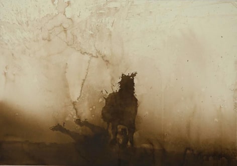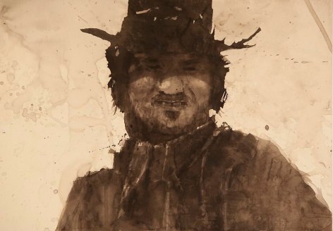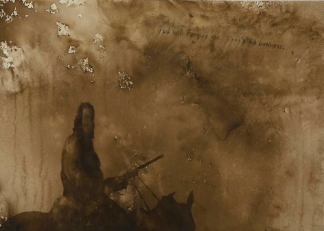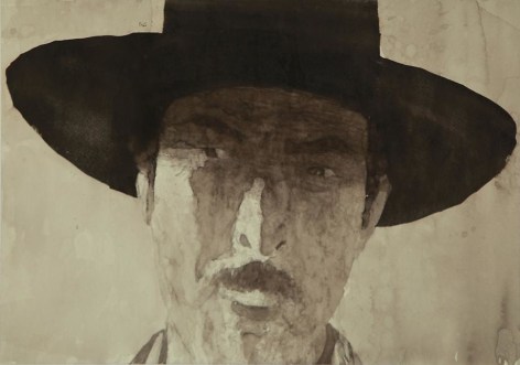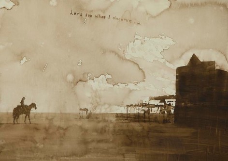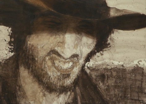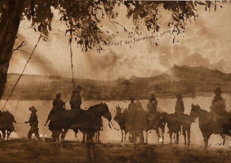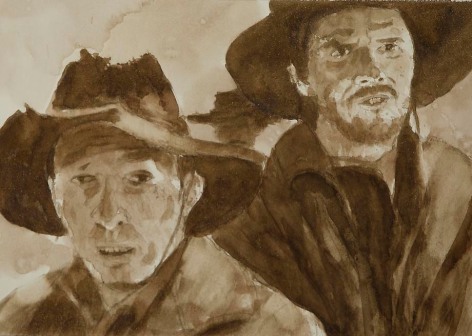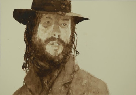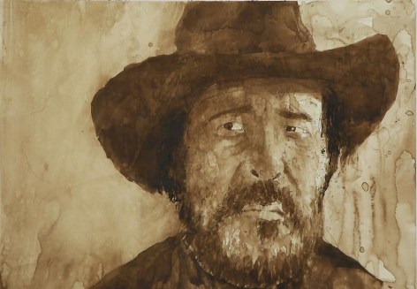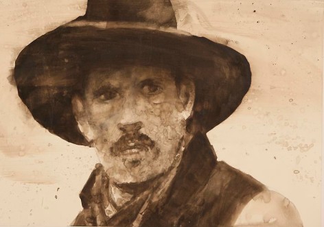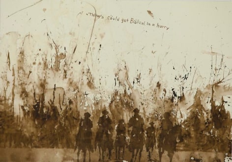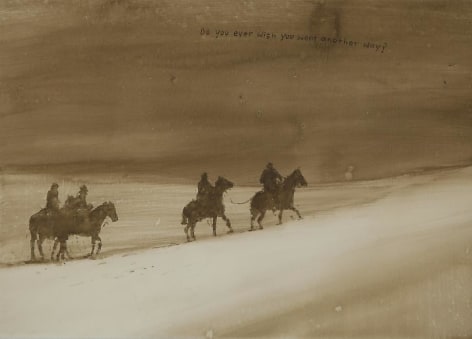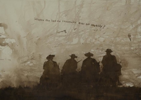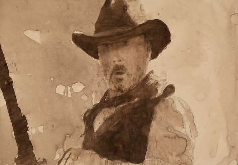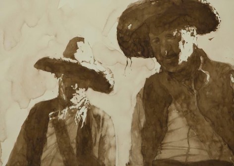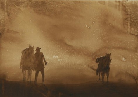 In a monochromatic sepia-toned palette, Rathman's work depicts ghostly silhouettes of ambiguous gunslingers in Stetsons riding their trusty steeds across a barren landscape. Reminiscent of old shoddy film stills, the loose qualities of his painting technique evoke a shadowy nostalgia culled from pooling whiskey on an aging oak tabletop. Lonely as they seem, these romanticized figures of the past seem at home within the environments that echo their existence; hazy and ephemeral through the eyes of the viewer. Oftentimes these human mirages fuse into their backgrounds, as if struggling for sovereignty from their dusty tension-filled environments. The effect is one of haunting wistfulness for the historical narratives associated with “manifest destiny,” or for the fictionalized storytelling of Hollywood cinema as remembered by a young child. Rendered in the contrasting depth and frailty of watercolor, Rathman’s cowboy vignettes grapple with notions of sexuality, faith, mortality and melancholy. Similarly, Rathman's second video work debuts after eighteen months and four collaborators. "Strange Arithmetic" revisits the artist's reminiscent panoramas in the form of a moving narrative—complete with foreboding soundtrack. In tandem with the video, the paintings appear as stills from an enduring adventure fraught with yearning and peril – an astute allegory for the modern plight of male selfhood.