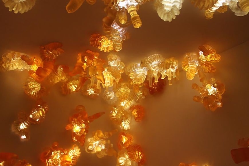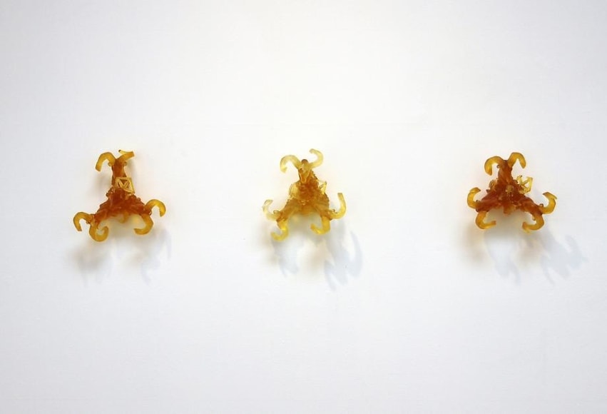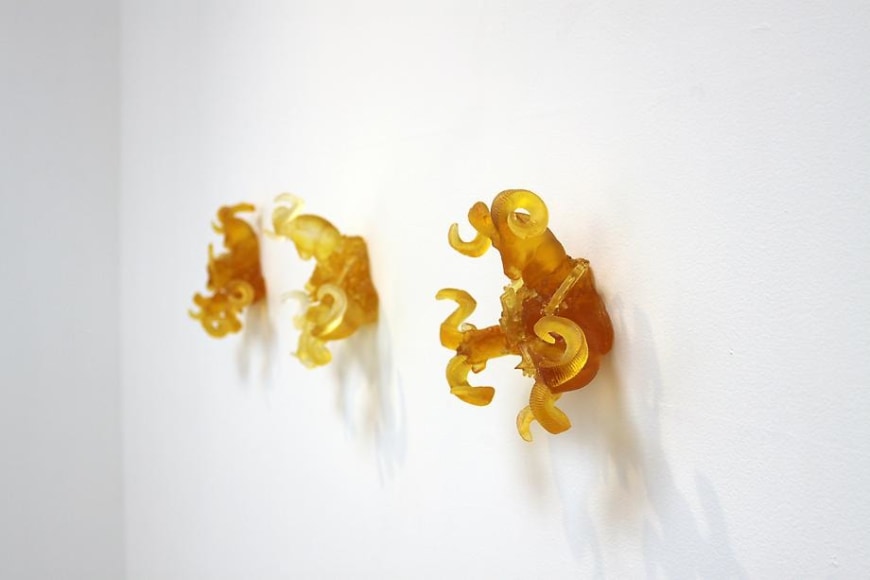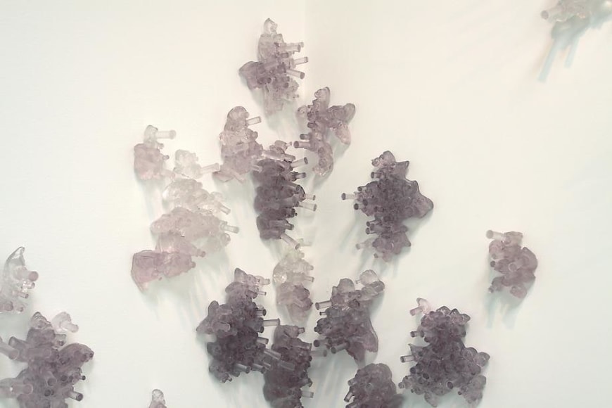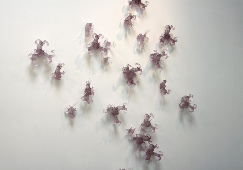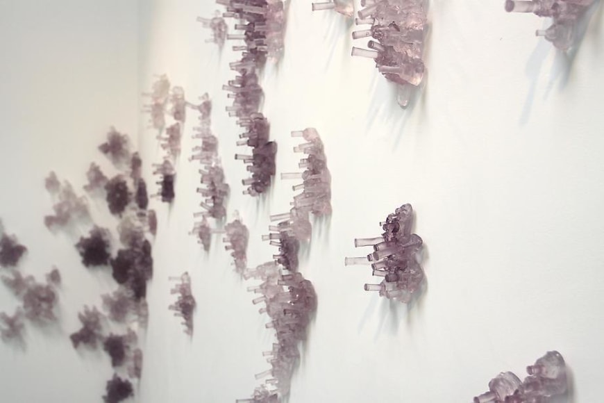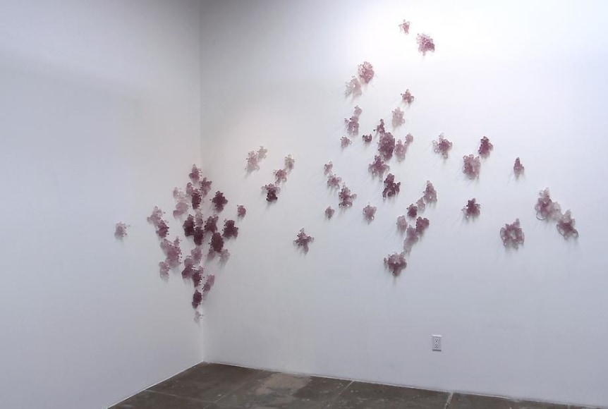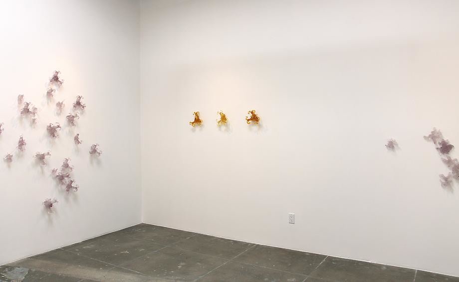 Long’s initial interest in phenomenology lead her to a practice dedicated to the physical world of corporeal experiences, namely light, space, and color. Through the transparent materiality of cast glass, wax, crystal, and plastic, the artist is able to imbue luminescence and color into cast appropriations of ubiquitous objects and detritus she serendipitously finds during her desert walks. By way of recasting litter such as rearview mirrors, truck hood ornaments, and bullet casings, each sculptural form transcends its manmade material qualities and becomes an artifact of nature, seemingly eroding and transforming into celestial rock formations. The artist then mounts these objects to a wall in groups that create immersive environments, evoking a cave-like world in which the discards of the everyday morph into immaculate gemstones. The resulting installations of light and color creates a intimate space in which the viewer may bypass the analytical world of language into a realm of corporeal experience and pure sensory pleasure. Through Long’s skillful alteration of space and context, each light-infused object functions as proof that in the end, there is only nature.