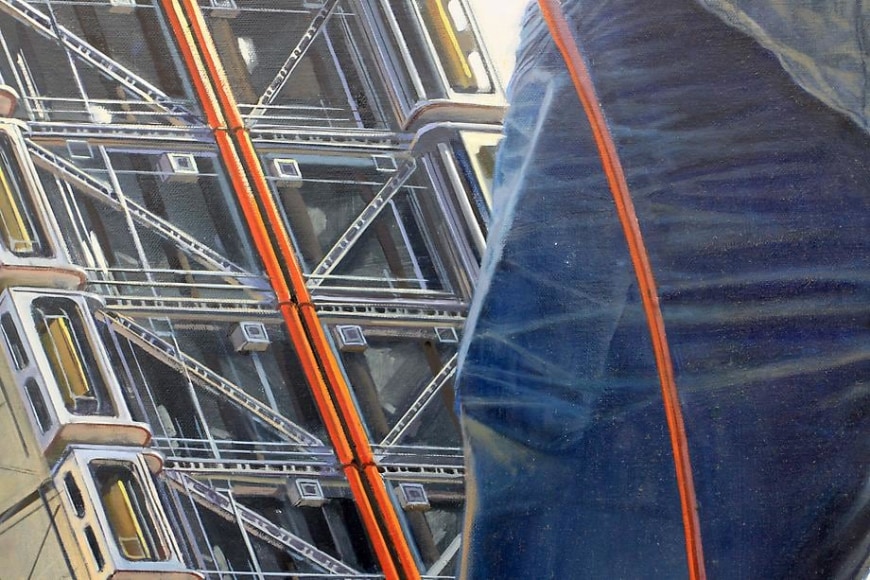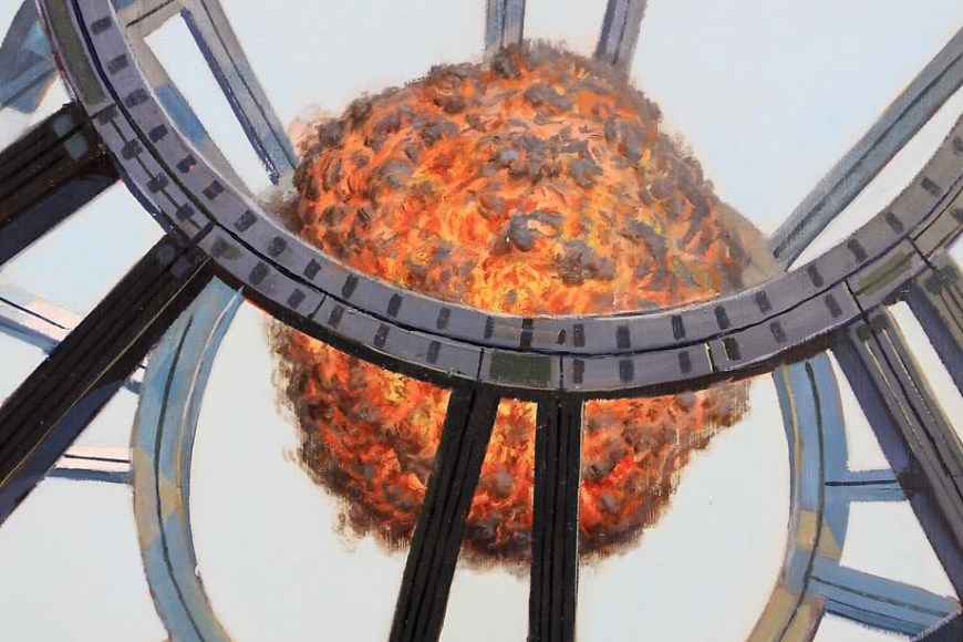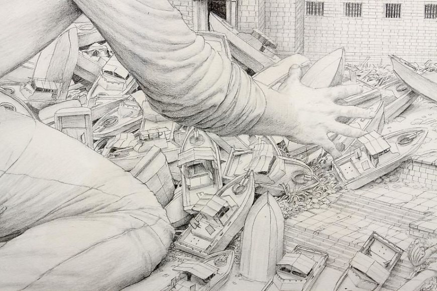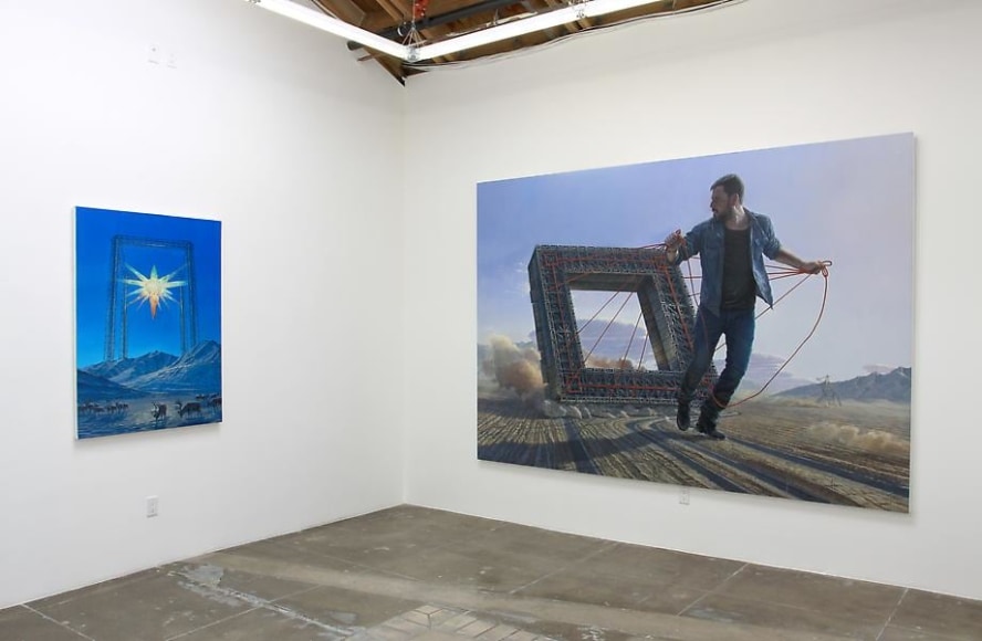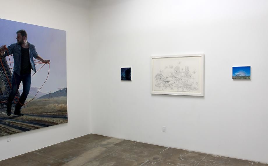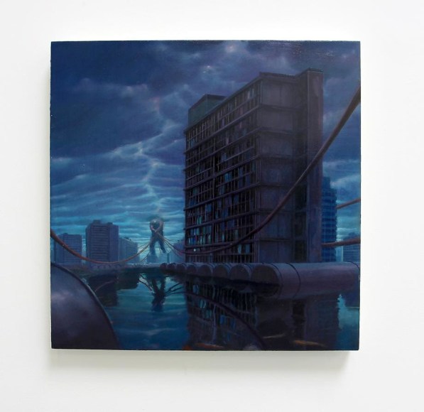 Roy's obsessive meticulousness is analogous to the objective of modernized globalization – no canvas remains bare as no frontier remains untouched. His compositional horror vacui is increasingly less science fiction than it is foreshadow, as infinite industrial horizons appear as foreign as sketches of the New World were once perceived. Though his tableaus appear largely unpopulated, Roy uses dilapidated structures and techno-iconography to express a Physicalist paradigm of the world. Alongside the remnants of an imperialist gluttony too large to sustain, Roy introduces a solitary figure of epic proportions – an allegorical projection of the artist himself as a world-building "giant." Drawing upon an art historical lineage, Roy recontextualizes Goya's colossus as a cipher for the insatiable search for ultimate knowledge. His figures underline the sublime and terrifying aftermath of a sociopolitical cupidity. Although he critiques the myth of an all-saving hero, Roy alludes to hope through the drama of a distant rising sun or luminous structures – as though salvation waits at the dawn of a collective enlightenment.