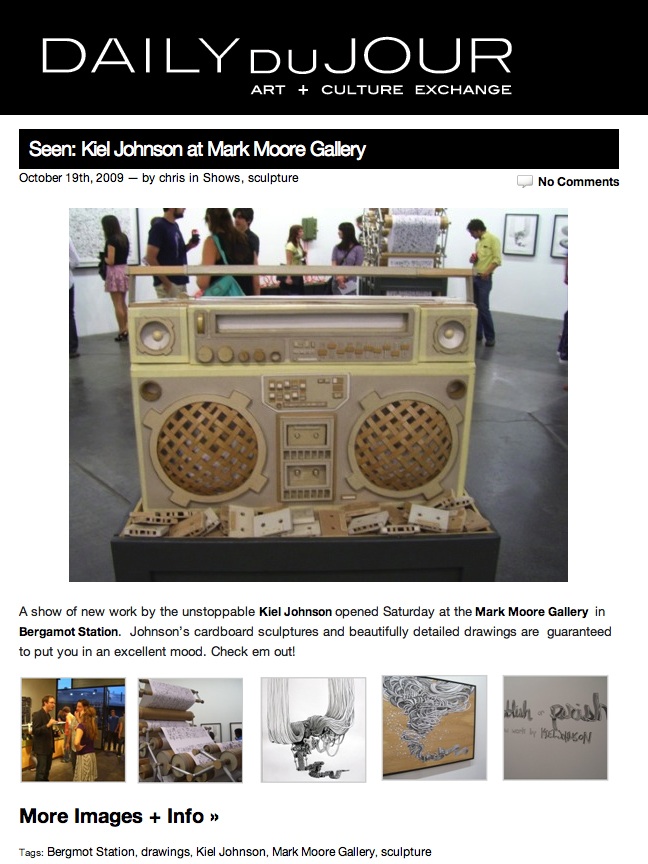 Following up his 2008 inaugural solo show with Mark Moore Gallery, Kiel Johnson invites us to step inside his compellingly prolific imagination with several new drawings and a large-scale sculptural installation.