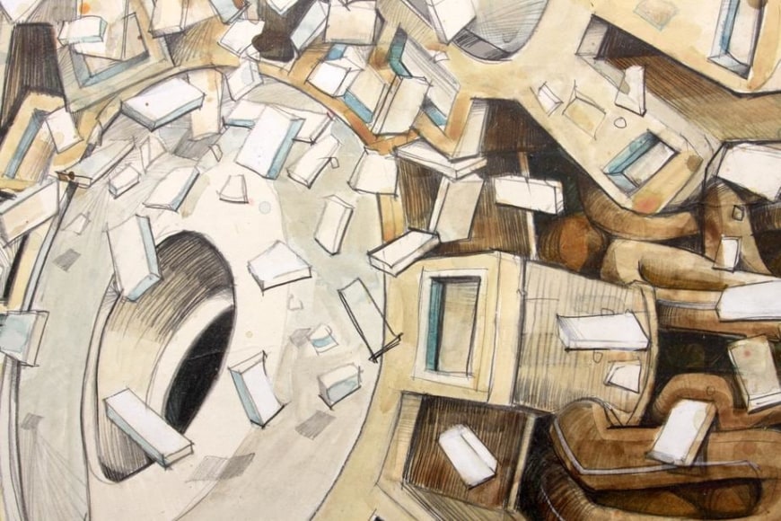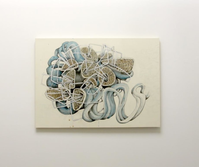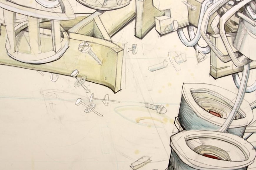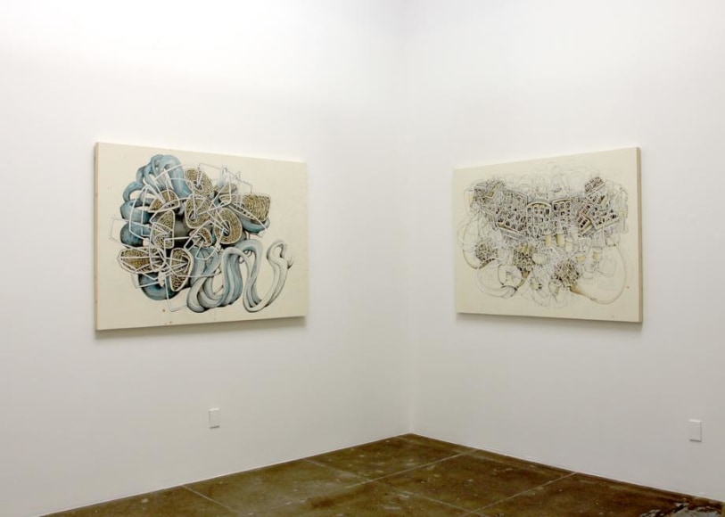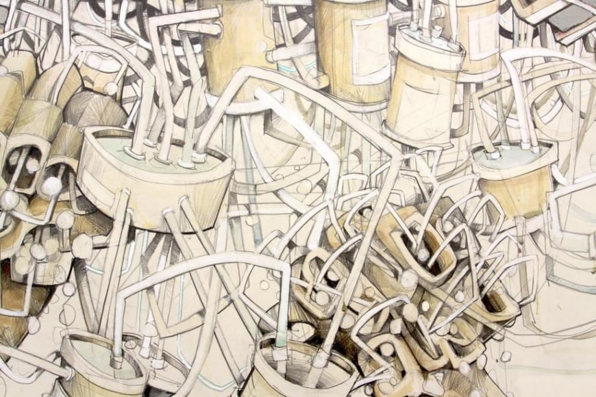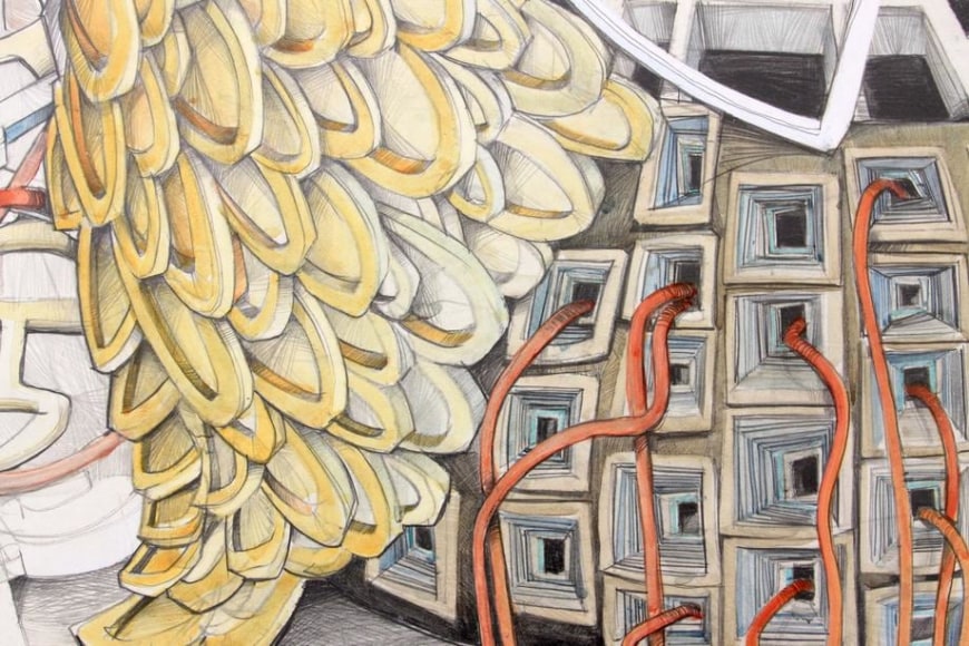 When beginning these works, Johnson became entranced by the sophisticated organization of structures and systems of bee populations; inspired by his newfound hobby of beekeeping. Despite their organic origins, beehives serve as a simulacrum of the intricate, yet chaotic, systems of organization present in contemporary industrialized society. The viewer will notice undulating patterns of hexagonal structures and hive-lake cavities in many of Johnson's compositions, all of which oscillate between regimen and chaos. His dystopian drawings appear as mind micro-universes, imagined cities, and complex, but inefficacious machinery. What initially appears as safe and secure is ultimately quite precarious in Johnson's hands – a purposeful equilibrium that relies on forces unseen, as is the case in many manmade and biotic environments. These elaborately constructed worlds will crumble at the slightest disruption of a single, minuscule cog in the machine. The artist’s imagery recalls the Reggio film Koyaanisqatsi (1984), which translates to ‘life out of balance.’ While society has built entwined, cultural structures, and blindly continues to abide by rules as to not disrupt the established order, we merely develop a failing system. To many, we are no longer in control of the very systems that we have built, which now dictate how we lead our lives. Through examining the futility of Kiel Johnson’s circuitous worlds, we become aware that not only are we viewing the artist’s endless imagination, but also looking into a mirror of contemporary humankind.