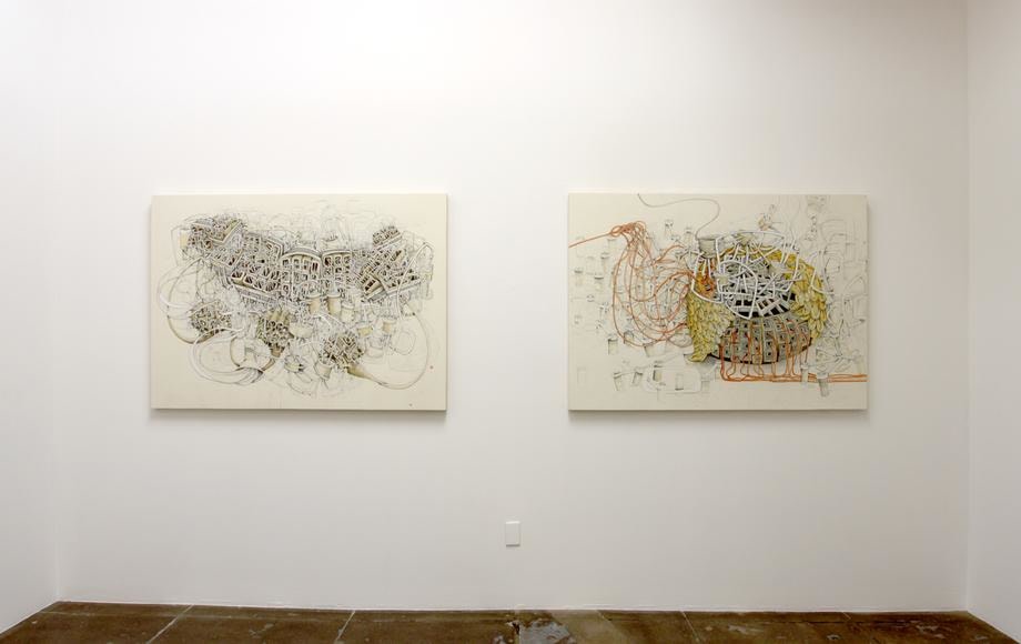 Mark Moore Gallery proudly presents "Walldayallday" in Gallery Two, a solo exhibition of new drawings by interdisciplinary artist, Kiel Johnson. Though most known for his cardboard and mixed-media sculptures, the artist will focus exclusively on his drawing expertise for the first time. Johnson is an incredibly skilled draftsman - fastidious in his manipulation of materials, and obsessive in his execution of intricate, elaborately imaginative structures. This new body of work fuses imagery and materials from his immediate surroundings with frenetic displays of his mechanical curiosity – an allusion to our modern web of organic and manufactured entities.