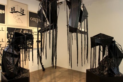 The focal points of the exhibition are two large-scale, wall sculptures entitled Campfire Barricade (2013-2014) and Debris Pile (2013-2014). Referencing apocalyptic tableaus captured in popular sci-fi motion pictures, these two sculptures resemble three-dimensional excavations of war barricades. Unlike Gordon Matta-Clark, who was interested in metamorphic gaps and dismantled architectural structures, Daniels is attracted to the dark, violent, biomorphic outcome manipulated in the existence of similar structures. His sculptures capture the slow and static moment of collapse and decay. Daniels continues his investigation into the breakdown of the practices and principles of construction through Painting With A Shotgun (2014) and The Grand Morphosis (2014). The collapse Daniels refers to is similar to the rise-and-fall of the Pruitt-Igoe urban housing project in St. Louis, Missouri. Shortly after its completion in 1954, the urban housing project began to decline due to overcrowding, crime, and economic restraints resulting in an epic demolition. The project has become an icon of failure through its advocacy of urban renewal and public policy planning. In Painting With A Shotgun, Daniels creates a cluster of archetypical images and text on canvas in response to these architectural and public policy catastrophes. The artist also makes reference to the L.A. architecture, and how its iconic buildings have become the voice and export of the city. The four sculptures that make up this body of work are Daniel’s observation on a building’s reaction to the psychological temperament of a space in which it inhabits. Much like the Pruitt-Igoe project, Los Angeles has been through many revitalizations and deteriorations. It is through these series of works that Daniels regards the lifecycle of architectural structures through the progress and decline of the environs around it.