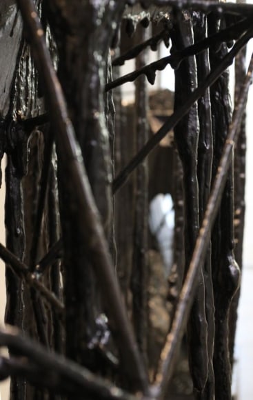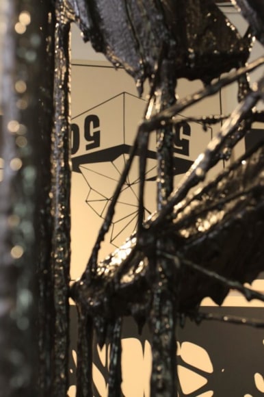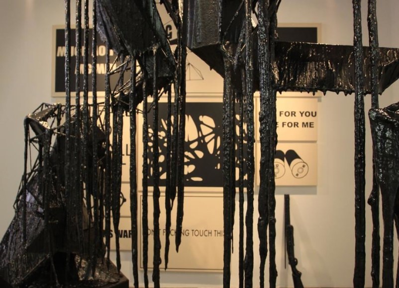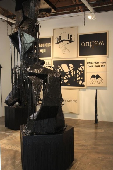 The focal points of the exhibition are two large-scale, wall sculptures entitled Campfire Barricade (2013-2014) and Debris Pile (2013-2014). Referencing apocalyptic tableaus captured in popular sci-fi motion pictures, these two sculptures resemble three-dimensional excavations of war barricades. Unlike Gordon Matta-Clark, who was interested in metamorphic gaps and dismantled architectural structures, Daniels is attracted to the dark, violent, biomorphic outcome manipulated in the existence of similar structures. His sculptures capture the slow and static moment of collapse and decay. Daniels continues his investigation into the breakdown of the practices and principles of construction through Painting With A Shotgun (2014) and The Grand Morphosis (2014). The collapse Daniels refers to is similar to the rise-and-fall of the Pruitt-Igoe urban housing project in St. Louis, Missouri. Shortly after its completion in 1954, the urban housing project began to decline due to overcrowding, crime, and economic restraints resulting in an epic demolition. The project has become an icon of failure through its advocacy of urban renewal and public policy planning. In Painting With A Shotgun, Daniels creates a cluster of archetypical images and text on canvas in response to these architectural and public policy catastrophes. The artist also makes reference to the L.A. architecture, and how its iconic buildings have become the voice and export of the city. The four sculptures that make up this body of work are Daniel’s observation on a building’s reaction to the psychological temperament of a space in which it inhabits. Much like the Pruitt-Igoe project, Los Angeles has been through many revitalizations and deteriorations. It is through these series of works that Daniels regards the lifecycle of architectural structures through the progress and decline of the environs around it.