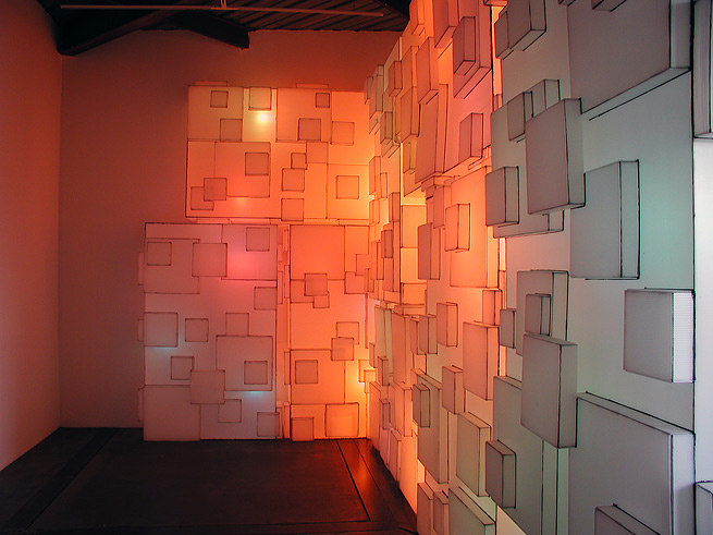 Over the past decade, Hendee has become known for all-encompassing, light-based installational works that push the viewer’s sense of space and geometry. Compared by Art Forum editor Tim Griffin to Kurt Schwitter’s fantastically constructed interior, Merzbau, Hendee’s work utilizes back-lit panels to create environments of flat planes in which all shadows are eliminated (Silent Sector is comprised of nine modular panels placed over a wall-mounted light array masked with colored gels).The effect, as Griffin points out, is to create “allover three-dimensional fields that are difficult to process.”