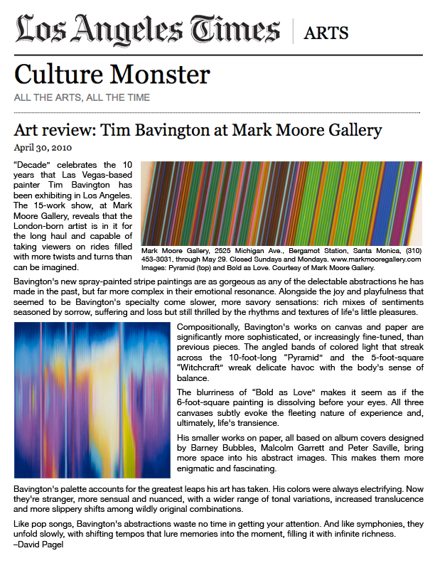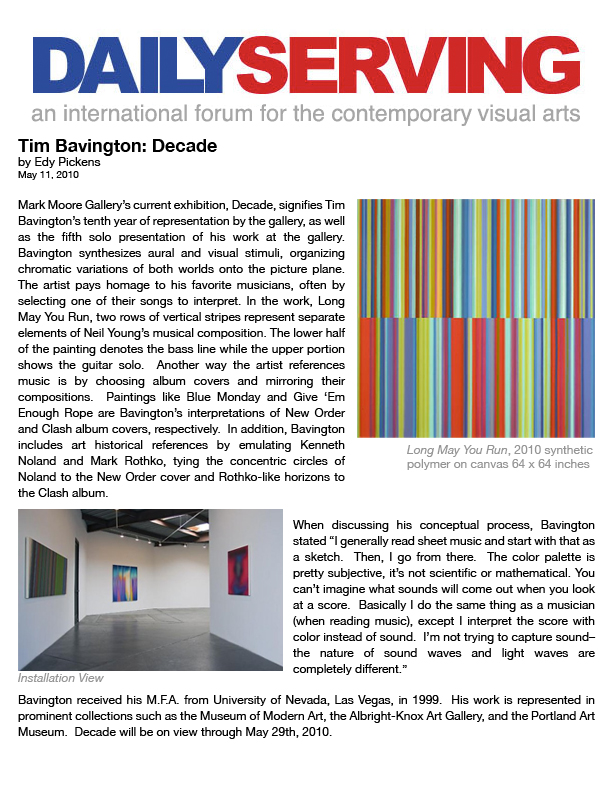 Mark Moore Gallery is thrilled to announce its fifth solo exhibition of new work by painter Tim Bavington. Marking Bavington's tenth year of representation by the gallery, "Decade" will feature a distinctive new body of work in addition to his iconic striped paintings and variations thereof.